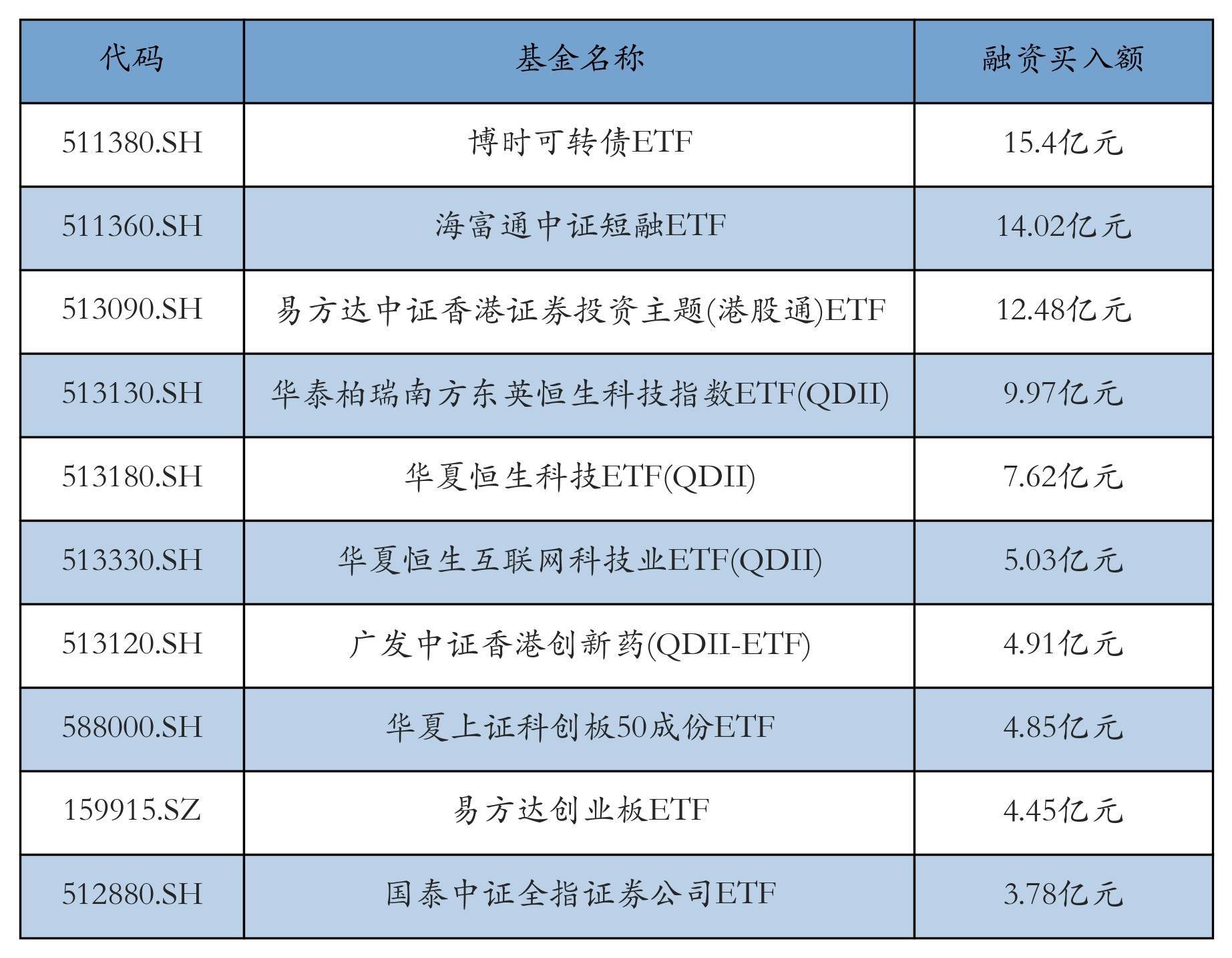 3月17日ETF融资买入额前三位分别为:博时可转债ETF(15.4亿元)、海富通中证短融ETF(14.02亿元)和易方达中证香港证券投资主题(港股通)ETF(12.48亿元),前10具体见下表: