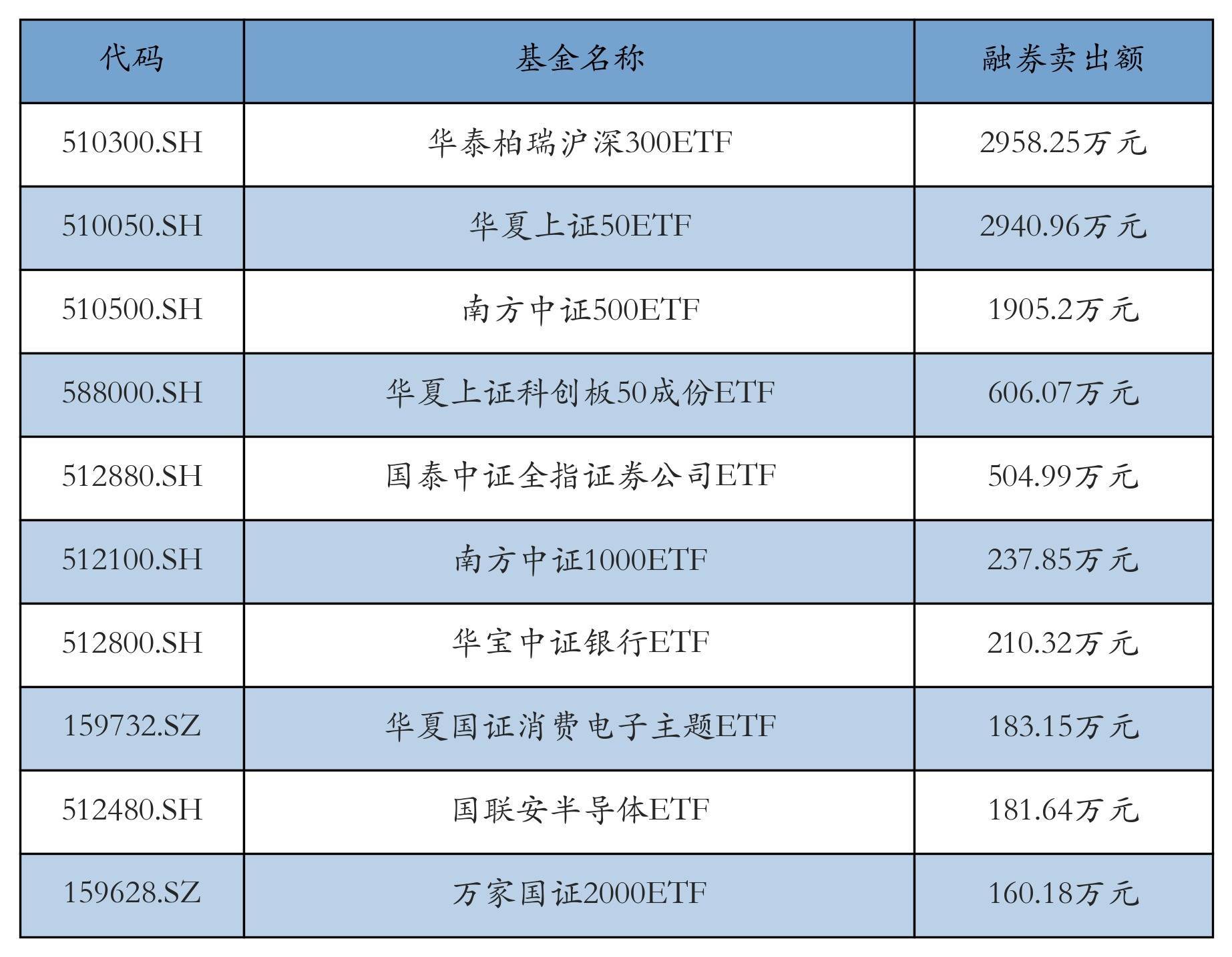 3月17日ETF融券卖出额前三位分别为:华泰柏瑞沪深300ETF(2958.25万元)、华夏上证50ETF(2940.96万元)和南方中证500ETF(1905.2万元),前10具体见下表: