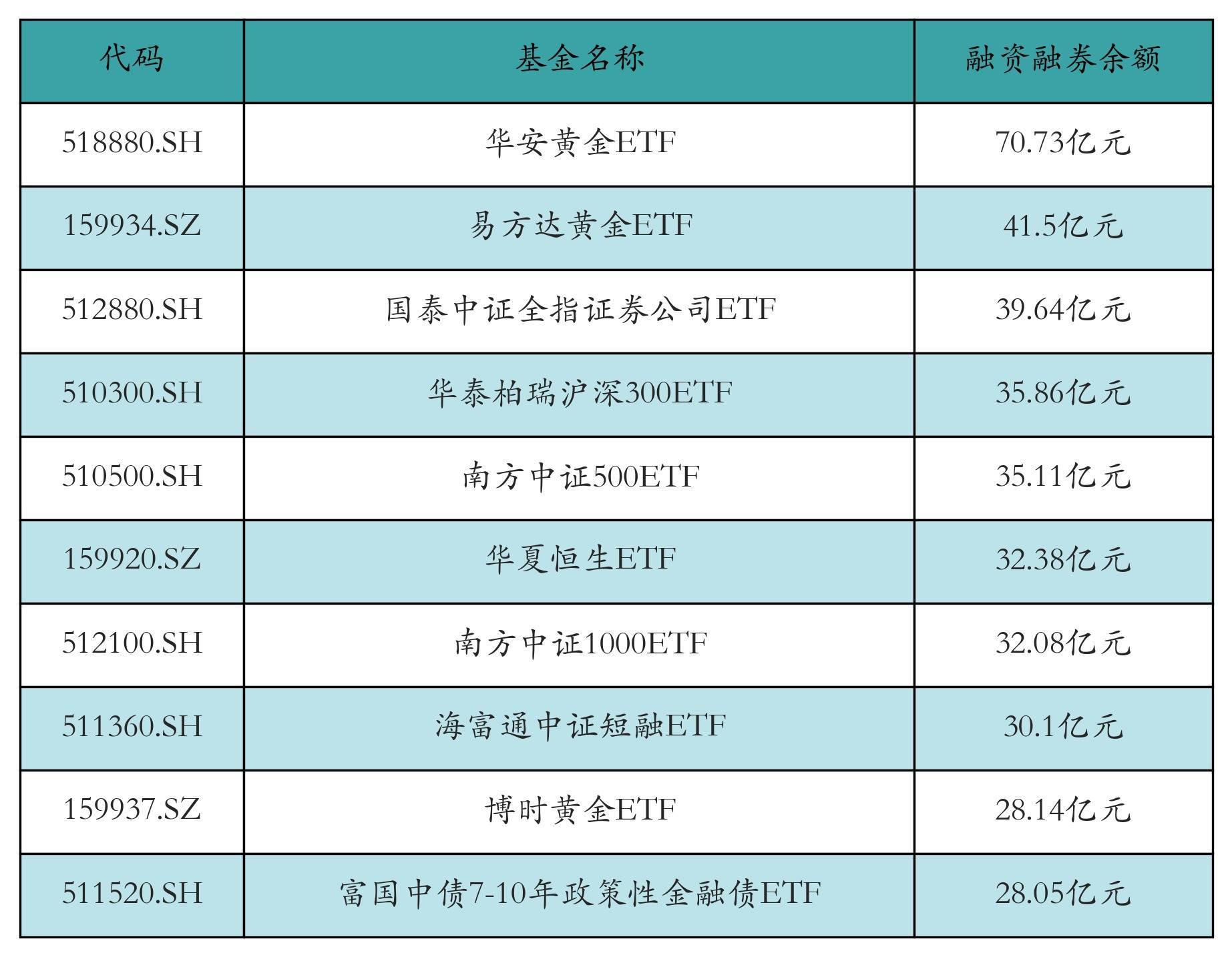 3月17日ETF两融余额前三位分别为:华安黄金ETF(70.73亿元)、易方达黄金ETF(41.5亿元)和国泰中证全指证券公司ETF(39.64亿元),前10具体见下表: