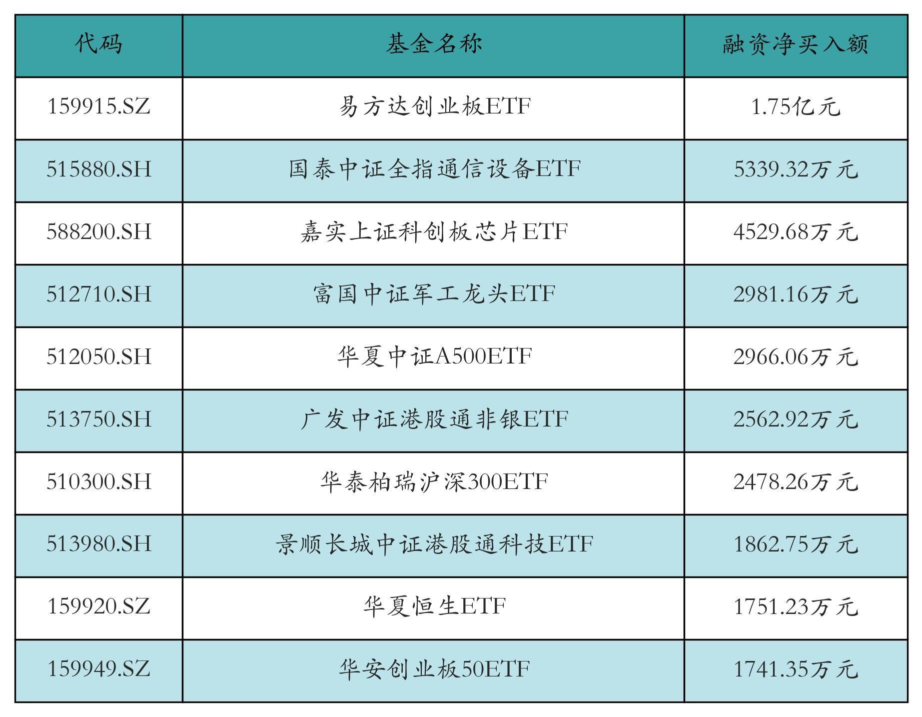 3月17日ETF融资净买入额前三位分别为:易方达创业板ETF(1.75亿元)、国泰中证全指通信设备ETF(5339.32万元)和嘉实上证科创板芯片ETF(4529.68万元),前10具体见下表: